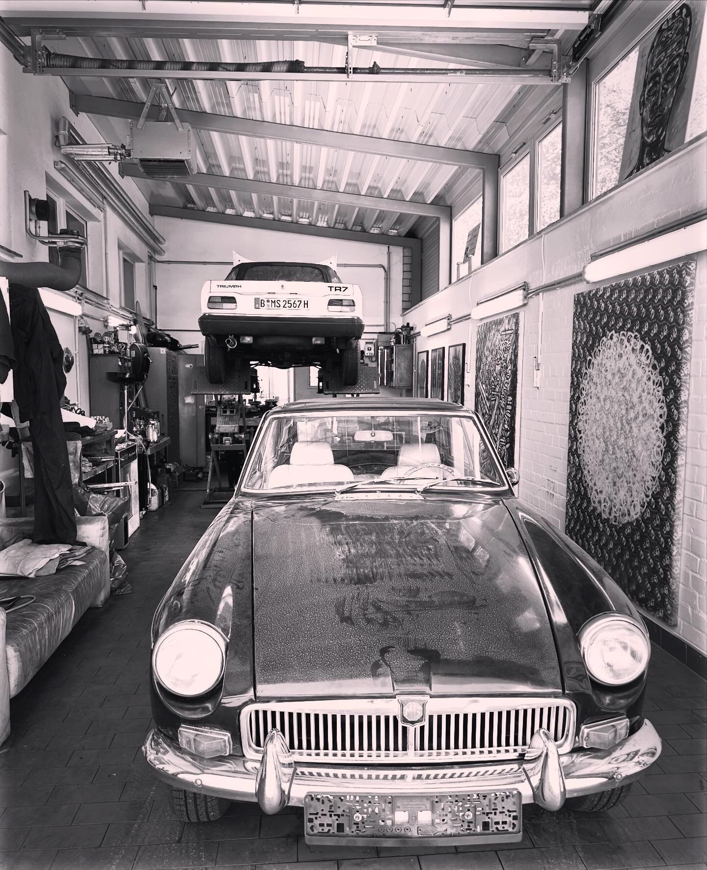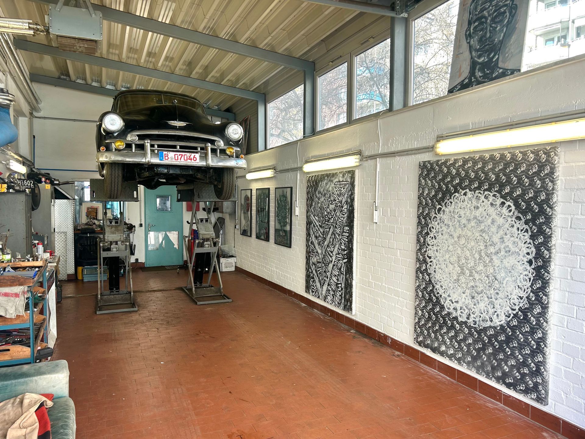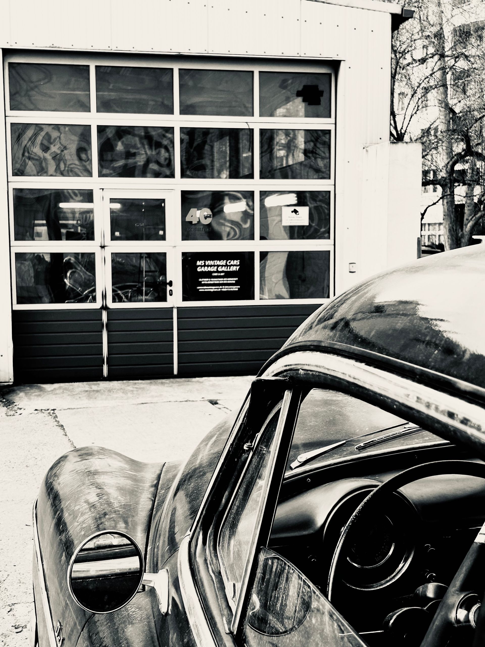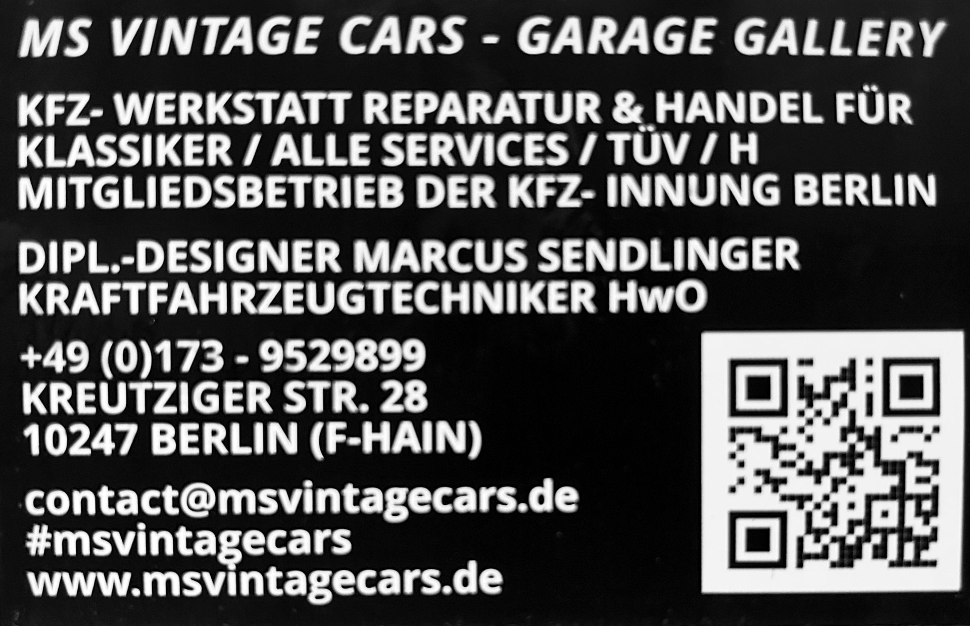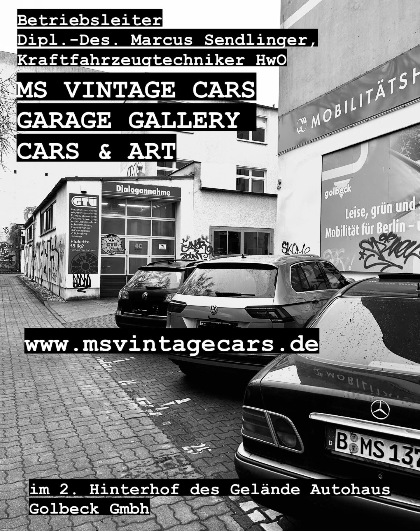 MS VINTAGE CARS - GARAGE GALLERY - ART & AUTO REPAIR SHOP / KFZ-WERKSTATT. MARCH 1st 2026 - FEBRUARY 28th 2027. SHOP OPENING TIMES - 11 am - 5 pm, MONDAY THROUGH FRIDAY. KREUTZIGERSTR. 28, 10247 BERLIN. WWW.MSVINTAGECARS.DE
